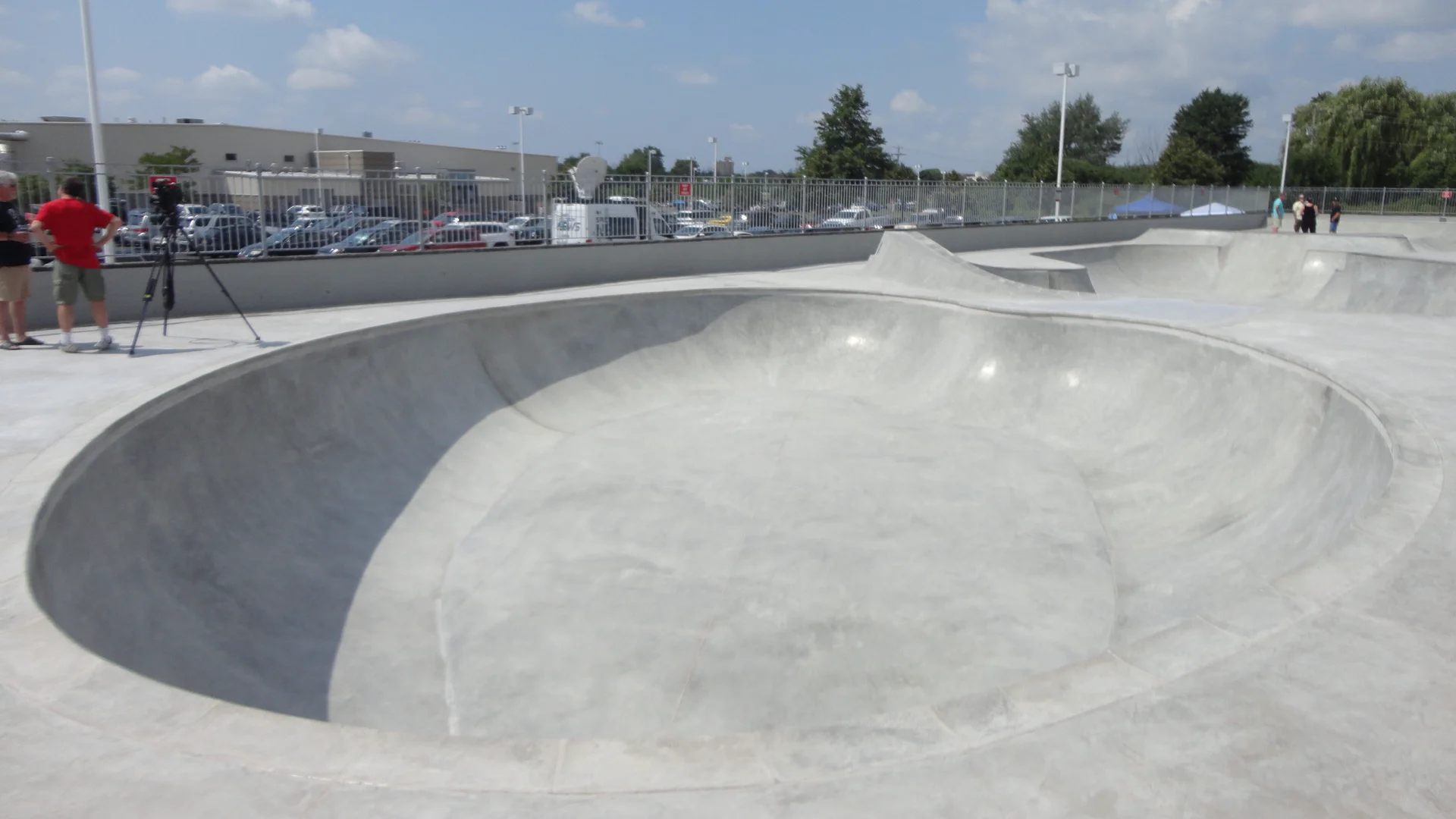 The park features extensive concrete work, including two bowls, quarter pipes, manual pad, stairs, ramps, and rails.